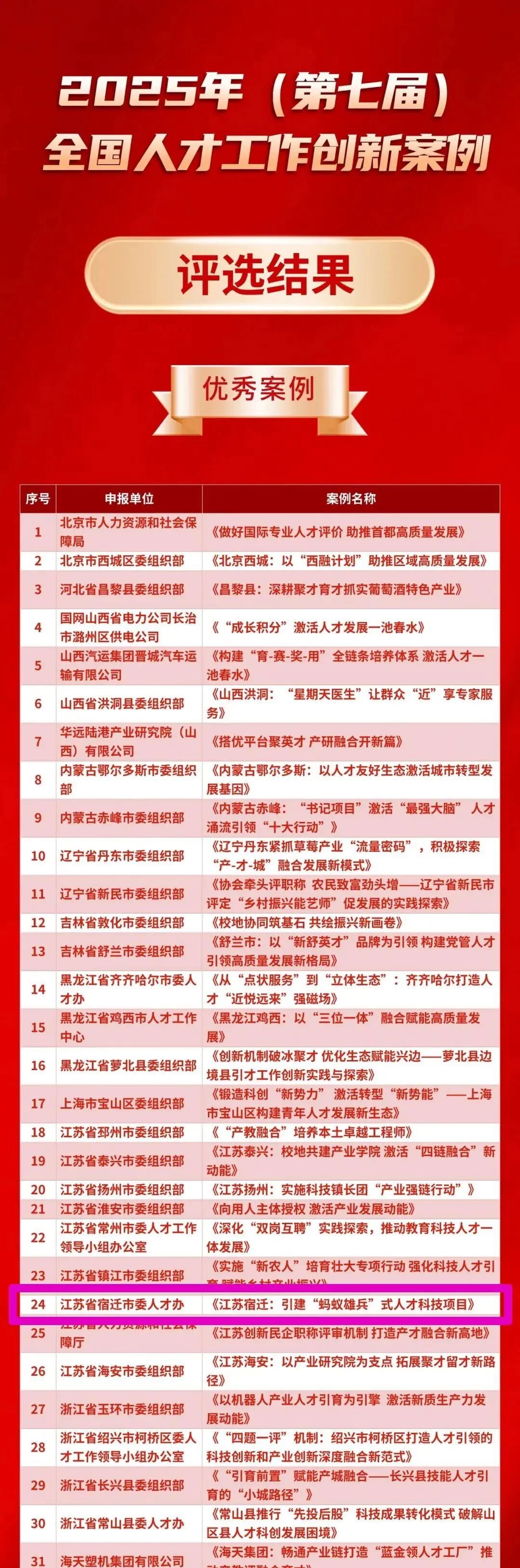 近日,中国人才杂志社公布2025年(第七届)全国人才工作创新案例评选获奖名单,宿迁市委人才办申报的《江苏宿迁:引建“蚂蚁雄兵”式人才科技项目》获评全国人才工作创新案例,宿迁人才工作已连续三届在全国人才工作创新案例评选中获评全国优秀案例,荣誉的背后是宿迁对人才科技项目的精准发力。